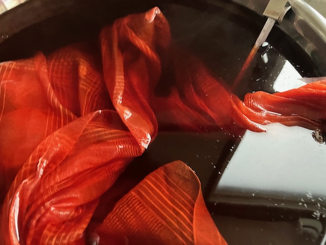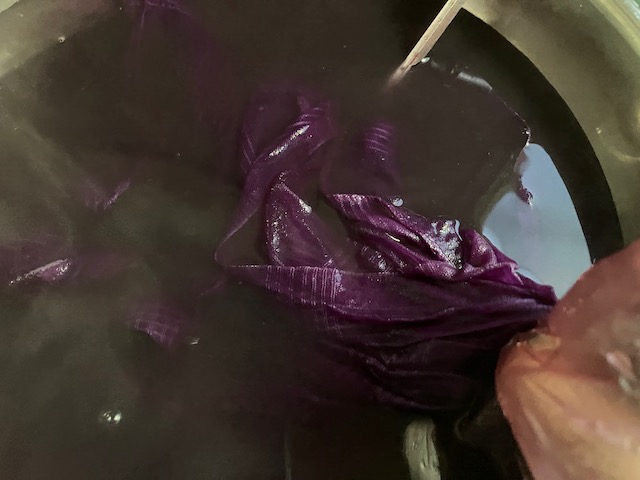 紫根染も生根と乾燥根をそれぞれ使い、生根の色素の湯揉み出し抽出と染色と媒染の重ね染、生根色素の無駄のない抽出方法をさらに研究しています。