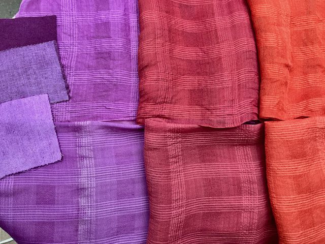 左から、紫根染羊毛布と苧麻布、 紫根染絹布  ニホンアカネと紫根重ね染   ニホンアカネ染