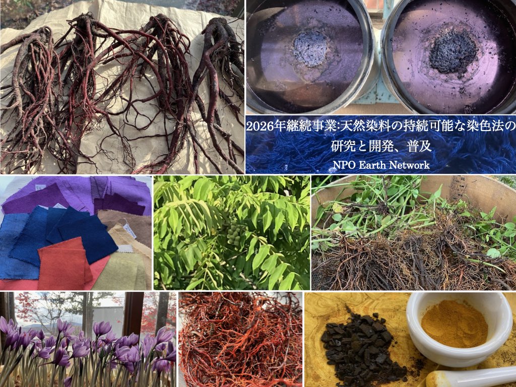 Main dyes to be used in 2026: Murasaki, the fermented Sukumo indigo vats, walnut, Rubia akane, saffron, Japanese pagoda tree